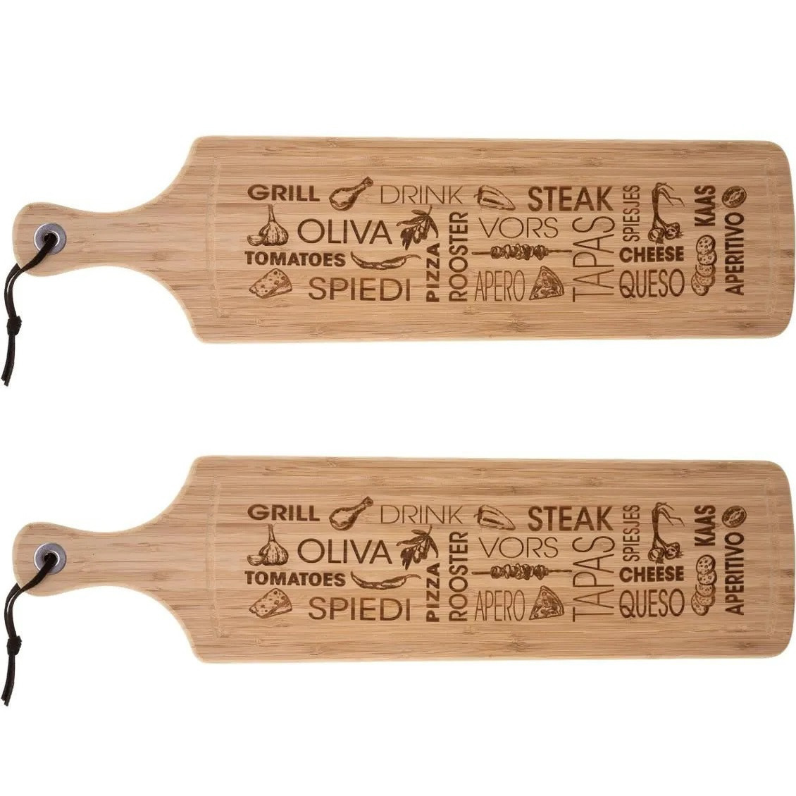 2x Stuks tapas serveerplank rechthoek 59 x 15 cm van bamboe hout. Stevige houten plank met handvat voor beter houvast en verschillende tapas teksten, de achterkant van de plank is blanco. Om de kwaliteit van de plank te behouden, is het aan te raden deze af en toe in te wrijven met een beetje plantaardige olie. Afmeting: ca. 59 x 15 x 2 cm. Materiaal: bamboe hout. Reinigen: hand afwas met een klein beetje mild afwasmiddel.