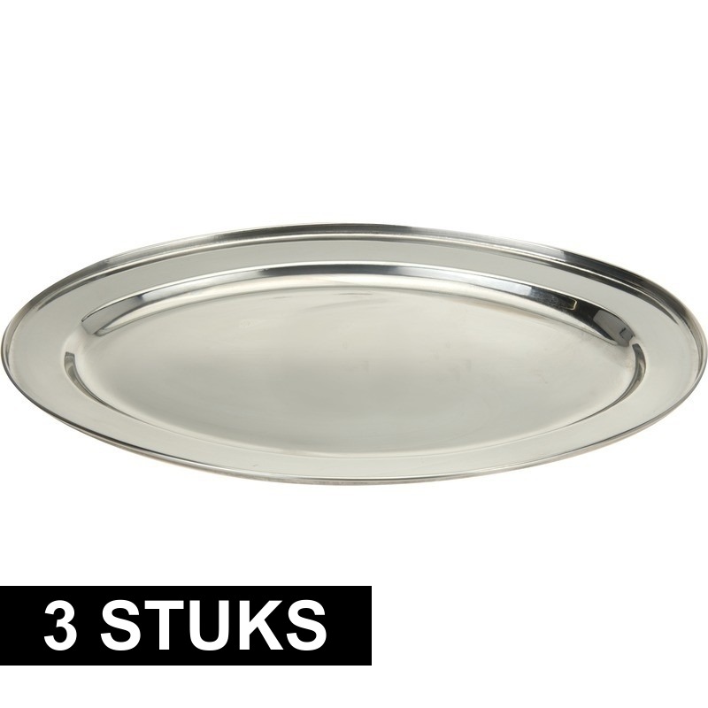 3x Ovale serveerschalen om bij bijvoorbeeld een barbecue het vlees op te serveren of een lekkere salade. Afmeting: ca. 40 x 26 cm. Materiaal: RVS, roestvaststaal. Makkelijk schoon te maken onder de kraan met wat afwasmiddel. Barbecueschalen/vleesschalen/serveerschalen.