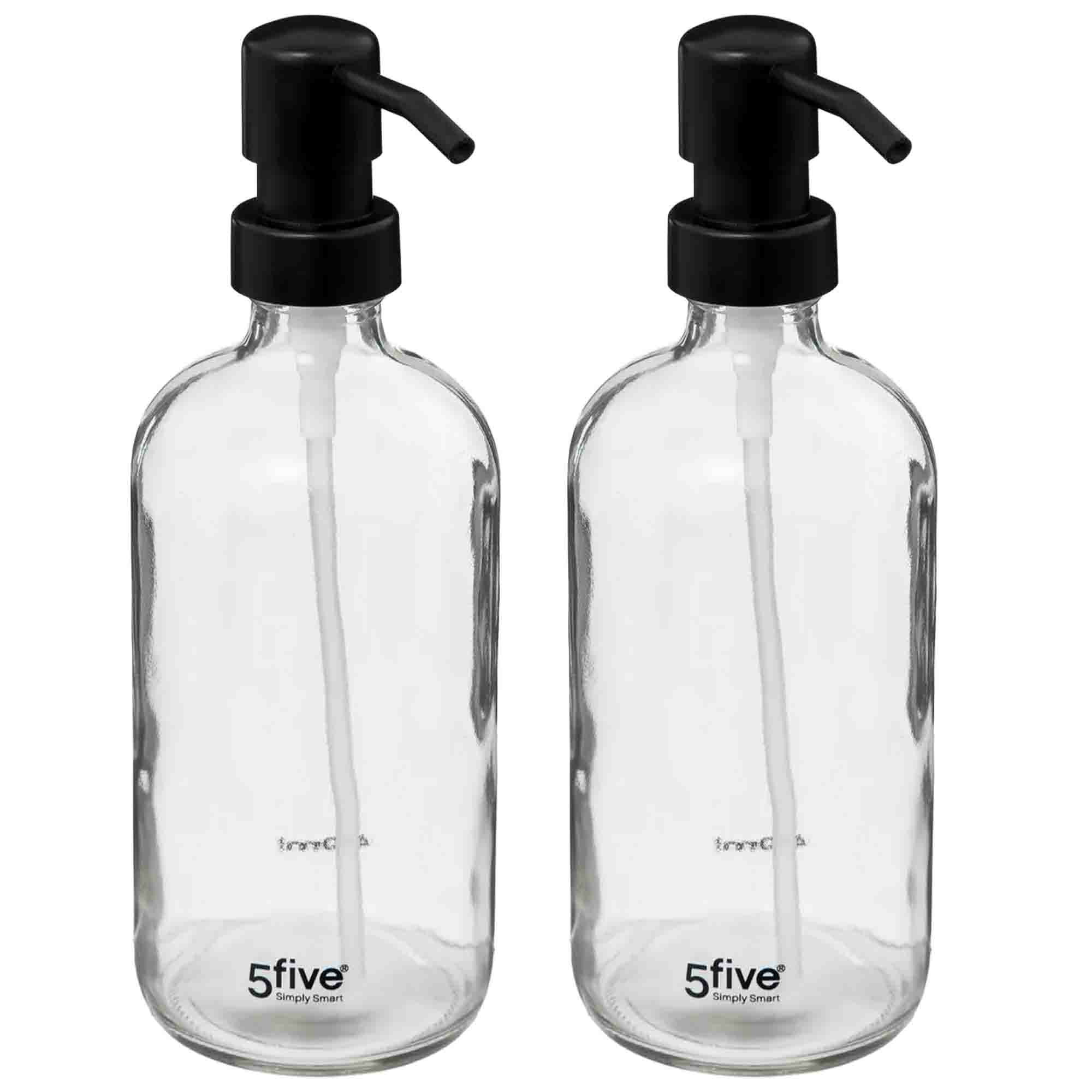 2x five zeeppompje/zeepdispenser van glas. Dit navulbare zeeppompje is een praktische ?n stijlvolle toevoeging aan keuken, badkamer of toilet. Vul het eenvoudig met je favoriete handzeep, lotion of afwasmiddel en geniet van gemak in het dagelijks gebruik. Dankzij het herbruikbare ontwerp is het pompje keer op keer opnieuw te vullen, waardoor het niet alleen handig maar ook een mooie eyecatcher is in huis. Het pompje heeft een moderne uitstraling door het glas met het zwarte pompje. Afmeting: ca. 10 x 21 cm. Inhoud: 450 ml. Materiaal: glas.