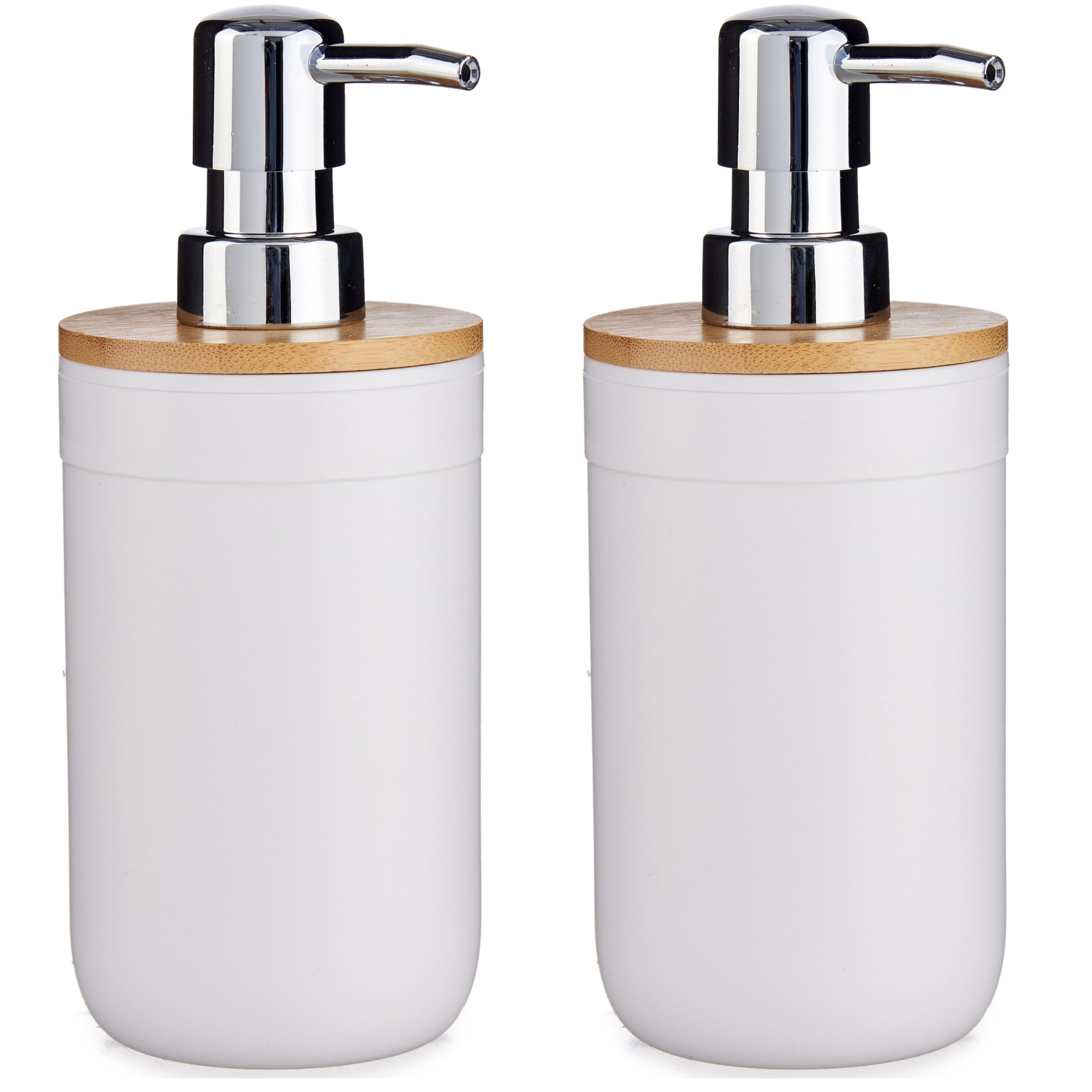 2x zeeppompje/zeepdispenser van kunststof. Dit navulbare zeeppompje is een praktische ?n stijlvolle toevoeging aan keuken, badkamer of toilet. Vul het eenvoudig met je favoriete handzeep, lotion of afwasmiddel en geniet van gemak in het dagelijks gebruik. Dankzij het herbruikbare ontwerp is het pompje keer op keer opnieuw te vullen, waardoor het niet alleen handig maar ook een mooie eyecatcher is in huis. Afmeting: ca. D8 x H17 cm. Materiaal: polypropyleen met bamboe deksel en rvs pompje. Inhoud: ca. 350 ml. Navulbaar: ja.