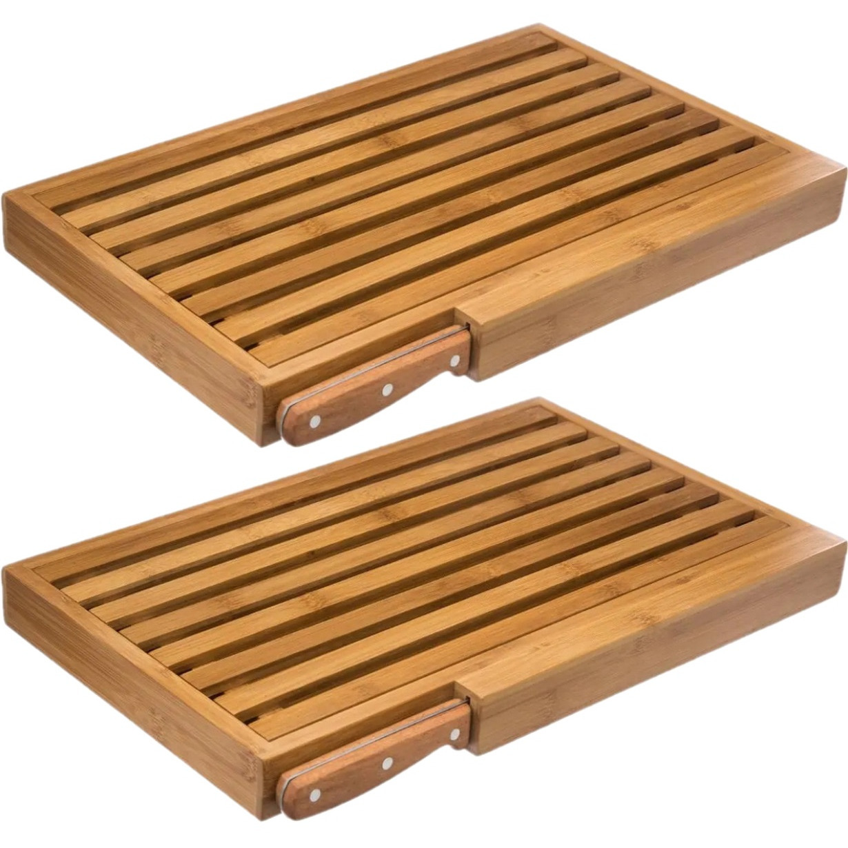 Brood snijplank – 2x – met kruimel opvangbak – 44 x 27 cm – bamboe hout – inclusief broodmes