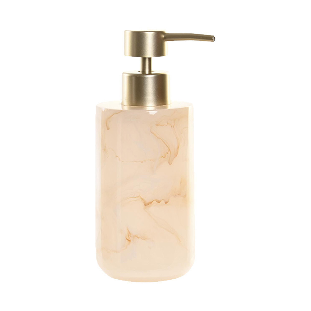 Stijlvol Zeeppompje/dispenser marmer look polyresin creme roze 9 x 17 cm. Dit navulbare zeeppompje is een praktische ?n stijlvolle toevoeging aan keuken, badkamer of toilet. Vul het eenvoudig met je favoriete handzeep, lotion of afwasmiddel en geniet van gemak in het dagelijks gebruik. Dankzij het herbruikbare ontwerp is het pompje keer op keer opnieuw te vullen, waardoor het niet alleen handig maar ook een mooie eyecatcher is in huis. Met goud-kleurig pompje.