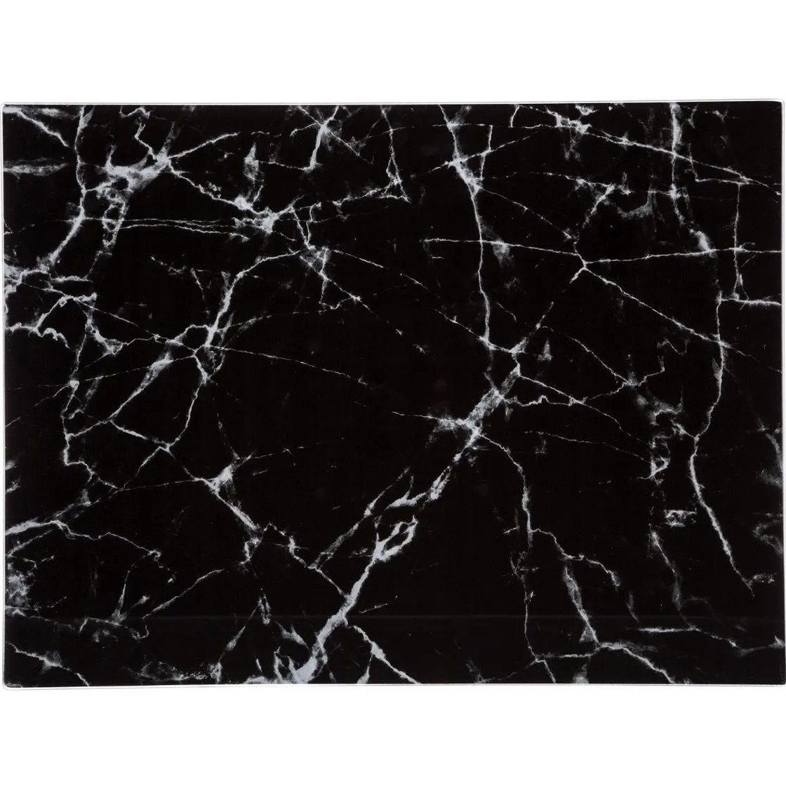 Snijplank rechthoek 40 x 30 cm zwart met marmer print van glas. Stevige glazen snijplank/broodplank/serveerplank met siliconen antislip voetjes en hittebestendig tot 200 graden. De plank is makkelijk en snel schoon te maken en neemt geen geuren en smaken op. Afmeting: ca. 40 x 30 x 0,5 cm. Materiaal: (gehard) ESG-veiligheidsglas. Reinigen: hand afwas met een klein beetje mild afwasmiddel.